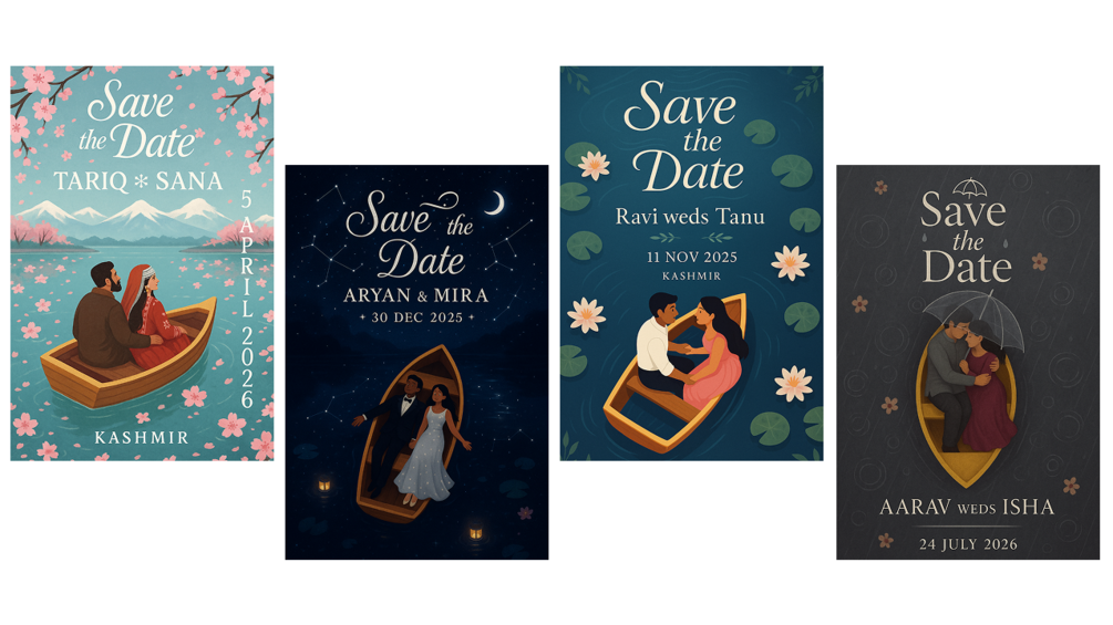 • Customizable variables: couple names, attire, pose, theme, water tone, river props, weather, typography style